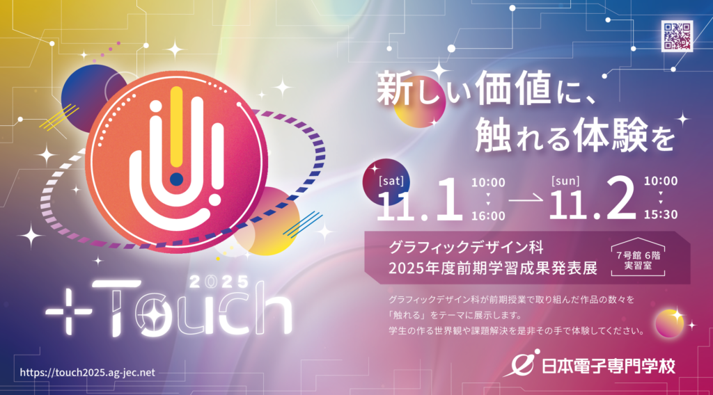 今年もグラフィックデザイン科では、+Touch展2025を開催します。この展示会はグラフィックデザイン科の2年次前期授業で制作した作品を中心に、学習成果を展示するものです。学園祭期間の2日間で開催いたします。ぜひお越しください!