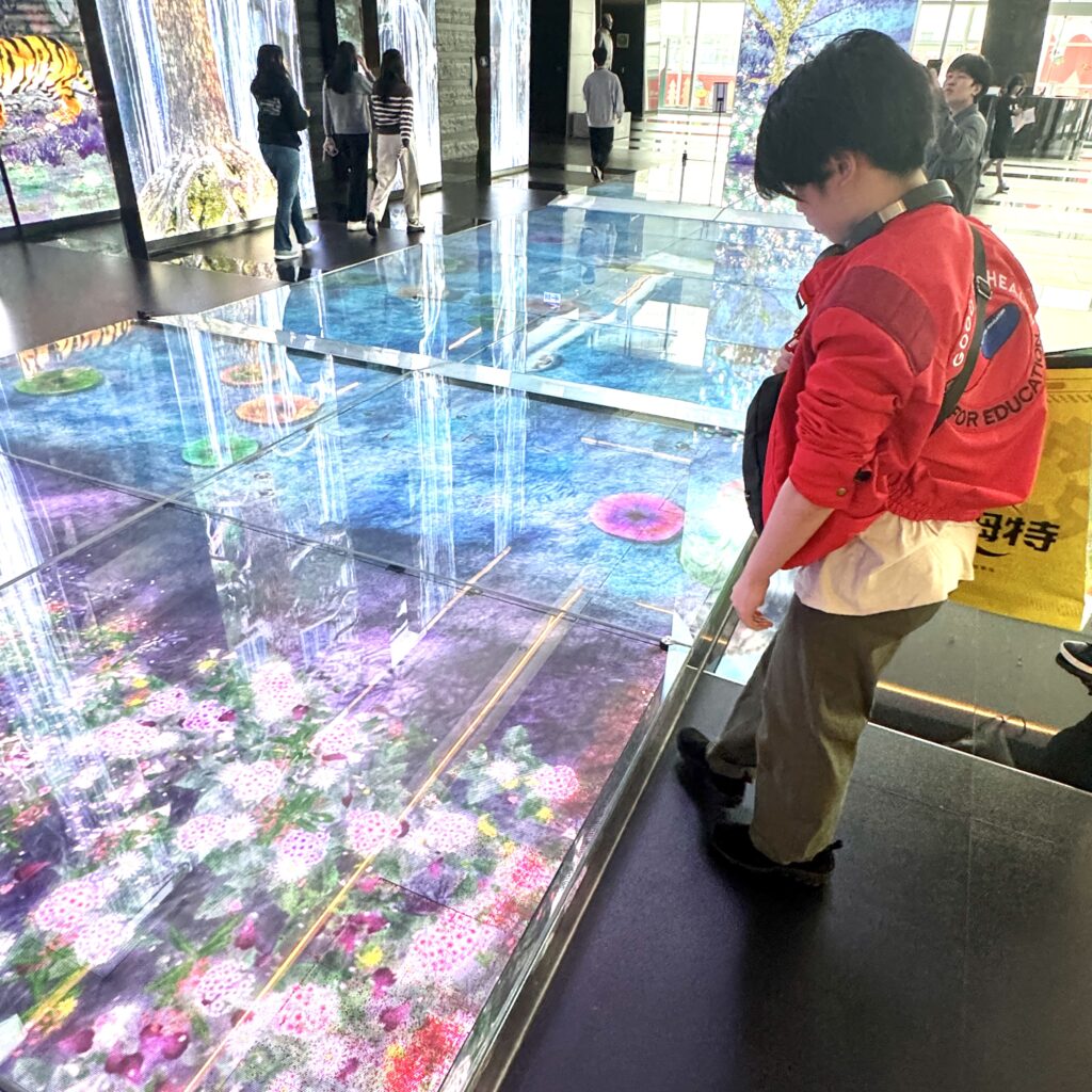この銀行はとても特徴的で、入口付近の床や壁がデジタルサイネージになっており、映像が映し出される近未来的な空間でした。思いがけない場所での映像表現に、CG分野の学生たちは大興奮。