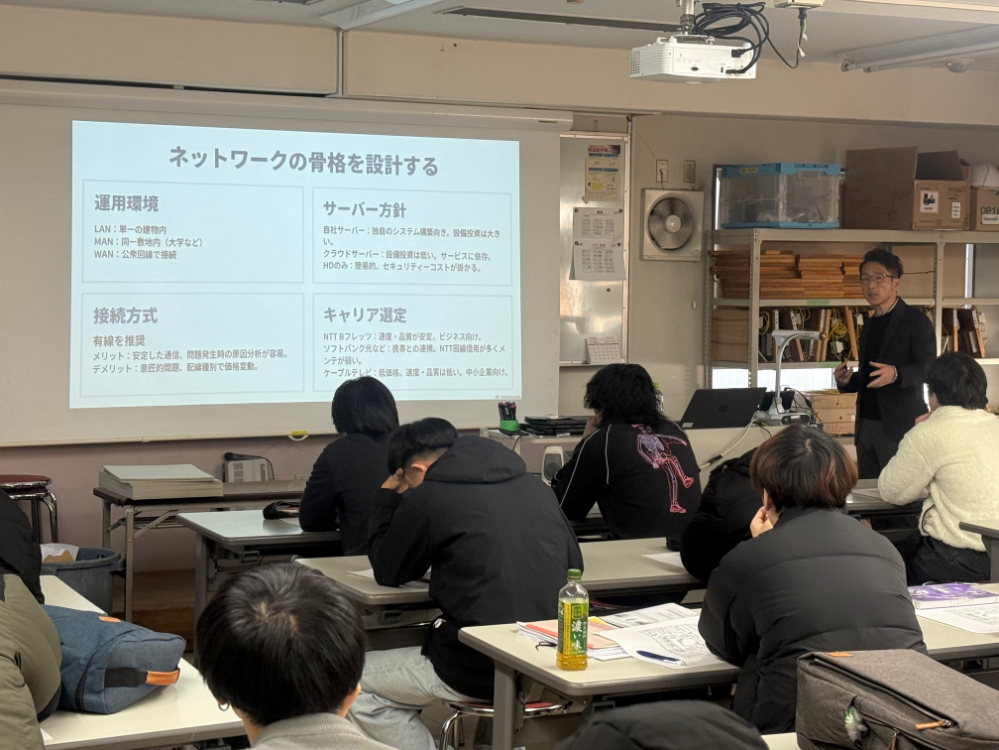 産学連携授業として、神奈川県西地区のNTT工事を線路設備事業部で一手に引き受けております神奈川電設株式会社様にお越し頂き、情報ネットワークの設計について講義をしていただきました。