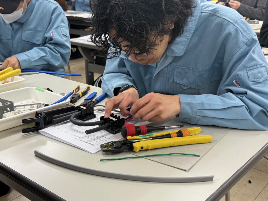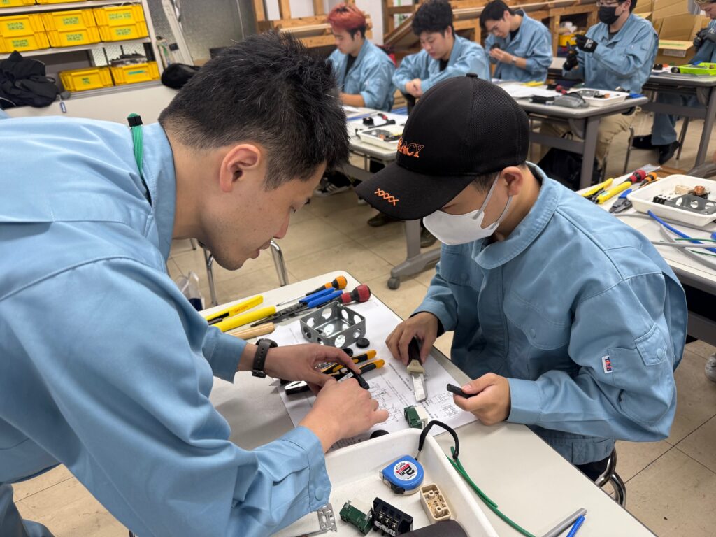 第一種電気工事士試験は年に2回あり、現在は下期の実技試験に向けた練習です。試験合格の重要なポイントを皆さんに学んでいただきます。