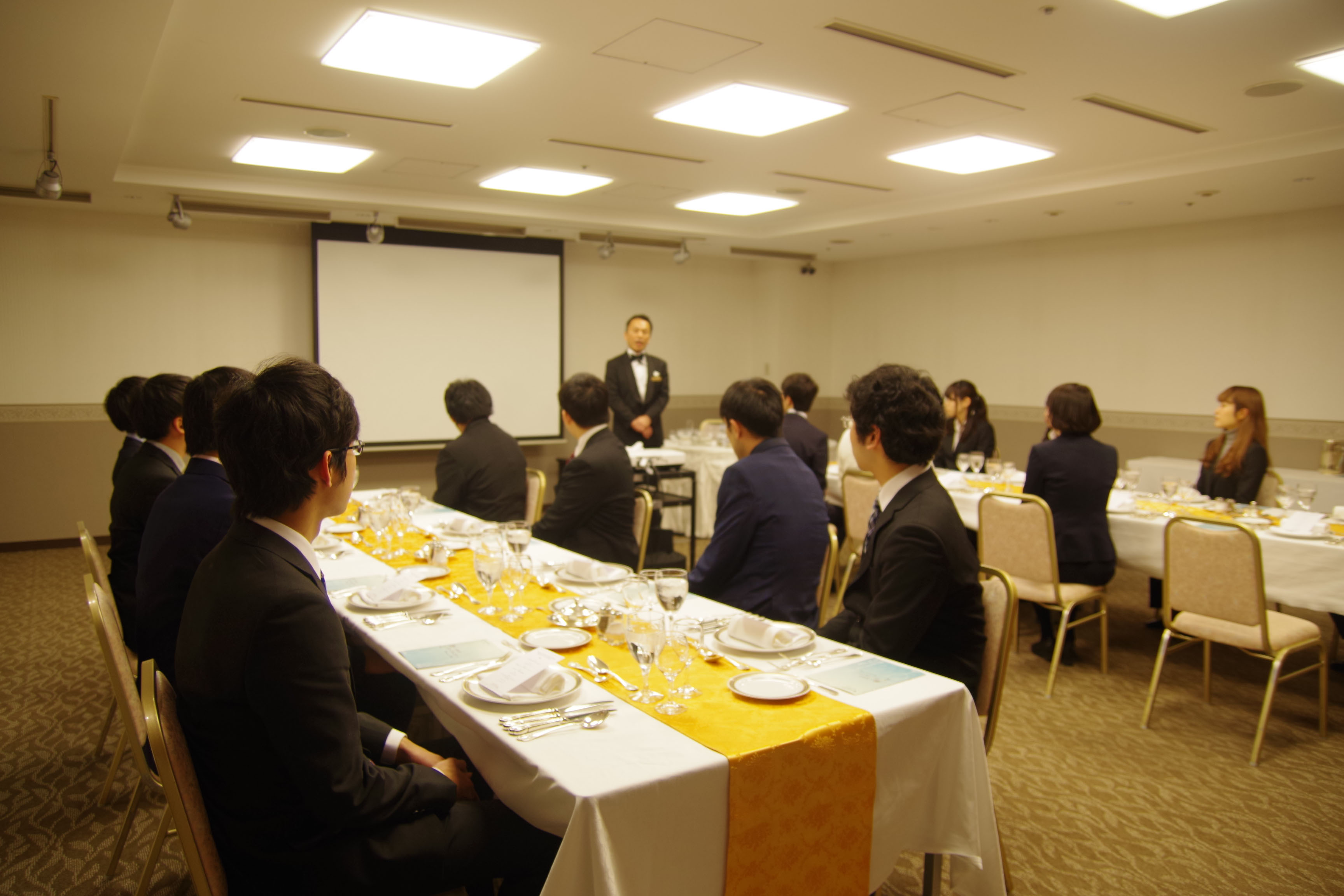 2月22日(金)、東京都千代田区の、客室や会食会場がある、アルカディア市ヶ谷私学会館にて、営業事業部料理課 バンケットチーフマネージャー課長代理 金縄 祐二様と営業事業部セールスチーフマネージャー 水野 貴史様のご協力のもと、テーブルマナーを教えていただきました。